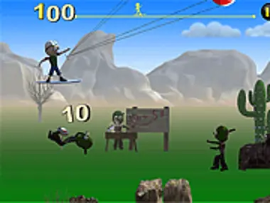 Invazia de zombi. Folosește placa și parașuta pentru a te mișca. Controlează jocul cu tastele săgeată. Conduci pe drum. Scopul tău este să intri în oraș. Pe drum vei întâlni mulți zombi, dușmani insidioși. Jocul are 12 nivele. Parcurge toate nivelele.